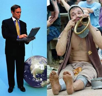 "That's you on the left - Used to be a Corporate Hosthot. But here's a job for you NOW - Horn Playing Homeless Beggar. You might have to dumb yourself down, but I like you a lot better without the fancy suit! Now you're a slacker like me! Not so dignified now but a lot more fun to be around!"